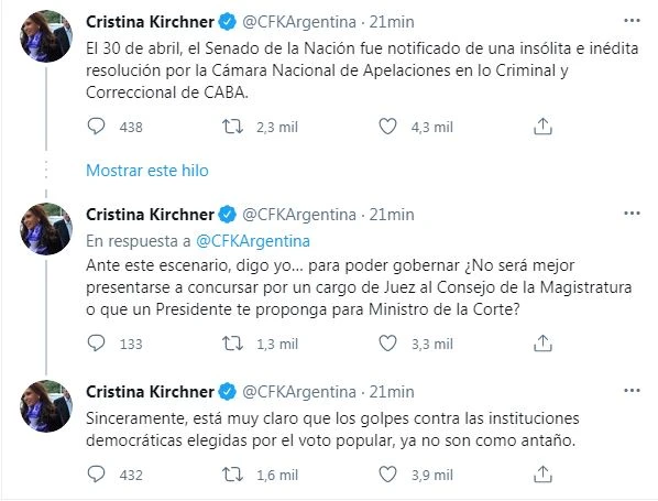 La vicepresidenta Cristina Fernández de Kirchner le envió un picante mensaje a los miembros de la Corte Suprema de Justicia de la Nación luego de que el máximo tribunal hiciera lugar a un pedido presentado por el gobierno porteño para decidir sobre la presencialidad de las clases en la Ciudad de Buenos Aires.  El mismo día en que su defensa pidió la nulidad de la causa por el Memorándum con Irán, la expresidenta salió al cruce de la  decisión que adoptó la corte contra el DNU del Gobierno Nacional que ordenaba suspender las clases por 15 días para reducir los contagios y aliviar el sistema sanitario.  A través de su cuenta de Twitter Cristina destacó que "El 30 de abril, el Senado de la Nación fue notificado de una insólita e inédita resolución por la Cámara Nacional de Apelaciones en lo Criminal y Correccional de CABA". Y en un tono mucho más picante la vicepresidenta se preguntó: "Ante este escenario, digo yo... para poder gobernar ¿No será mejor presentarse a concursar por un cargo de Juez al Consejo de la Magistratura o que un Presidente te proponga para Ministro de la Corte? "Sinceramente, está muy claro que los golpes contra las instituciones democráticas elegidas por el voto popular, ya no son como antaño", concluyó Cristina Fernández.