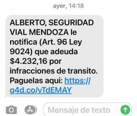 El jefe de Policía Vial, Iván Bermúdez, se refirió a los mensajes que reciben los ciudadanos en sus celulares, sobre multas viales. El comisario destacó que "esta no es la primera vez que se hace, ya se ha efectuado este tipo de notificaciones cuando se comete una infracción". Y aclaró "en el caso de estos mensajes, es una campaña que ha autorizado el Ministerio de Seguridad, a través de la que se notifica al infractor de que tiene una deuda pendiente con el Ministerio, pero no lo está intimando a pagar, sino que lo está notificando". Asimismo explicó que el link que figura en el mensaje no envía a una cuenta para efectuar el pago, sino a una página para hacer el seguimiento de la multa, poder efectuar el pago y luego obtener la constancia pertinente.