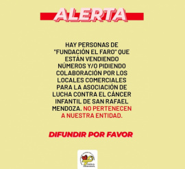 Desde la ONG aclararon que "hay personas de "Fundación Faro" que están vendiendo números y/o pidiendo colaboración por los locales comerciales para la Asociación de lucha contra el Cáncer Infantil de San Rafael, Mendoza. No pertenecen a nuestra entidad". Solicitan difundir esta información y hacer caso omiso en caso de recibir la visita de estas personas.