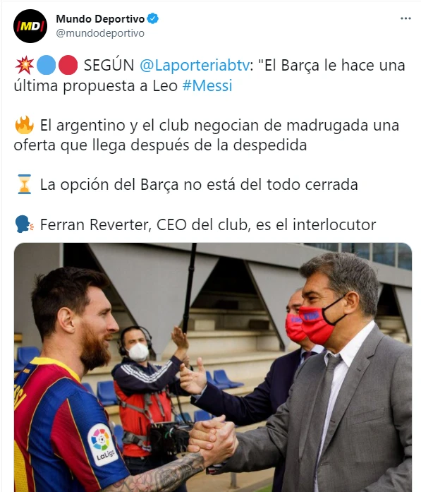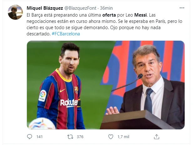 &iexcl;Terrible! En las primeras horas de este martes 10 de agosto en Europa, medios catalanes aseguran que el&nbsp;Barcelona&nbsp;prepar&oacute; una&nbsp;oferta&nbsp;de&nbsp;&uacute;ltimo momento&nbsp;y ya se la hizo saber al argentino&nbsp;Lionel Messi.&nbsp; &quot;El argentino y el club negocian de madrugada una oferta que llega despu&eacute;s de la despedida&quot;, sostiene el reconocido programa televisivo&nbsp;La Porter&iacute;a, de Catalu&ntilde;a. La informaci&oacute;n comenz&oacute; a ser replicada por otros importantes medios espa&ntilde;oles, como&nbsp;El Chiringuito&nbsp;o Mundo Deportivo. <p dir="ltr" lang="ca">????????&Uacute;LTIMA HORA ???? PROPOSTA FCB-MESSI El Bar&ccedil;a li fa una &uacute;ltima proposta a Leo Messi L&rsquo;argent&iacute; i el club negocien de matinada una oferta que arriba despr&eacute;s del comiat L&rsquo;opci&oacute; del Bar&ccedil;a no est&agrave; del tot tancada Ferran Reverter, CEO del club, &eacute;s l&rsquo;interlocutor pic.twitter.com/niBhT0vKhO &mdash; La Porteria (@Laporteriabtv) August 9, 2021 Durante la tarde del lunes, desde periodistas argentinos hab&iacute;a salido la versi&oacute;n de que Messi no se presentar&iacute;a este martes a primera hora en Francia para sellar su acuerdo con el&nbsp;PSG,&nbsp;sino que se tomar&iacute;a m&aacute;s tiempo para definir su futuro deportivo. Esto, con el correr de las horas, est&aacute; confirmado. Seg&uacute;n confirman desde el otro lado del mundo, las negociaciones no est&aacute;n cerradas y la oferta del club catal&aacute;n lleg&oacute; &quot;luego de la despedida&quot; del domingo. En estas horas, desde el entorno de Leo estar&iacute;an negociando la posibilidad del regreso al club de sus amores.&nbsp;
